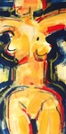 2017Schilderij, levendige, niet realistische kleuren van staand, ongekleed vrouwenfiguur