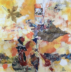 2021Abstract werk, bestaande uit 4 delen , elk 60x60 cm. Acrylverf, papier collage en bladeren op vezelplaat