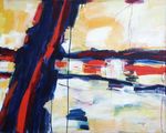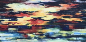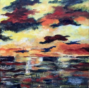 2013schilderij, dit had ook in de categorie "spiritueel" gepast, zeker gezien de titel. rivierlandschap met ondergaande zon, ietwat onheilspellend.